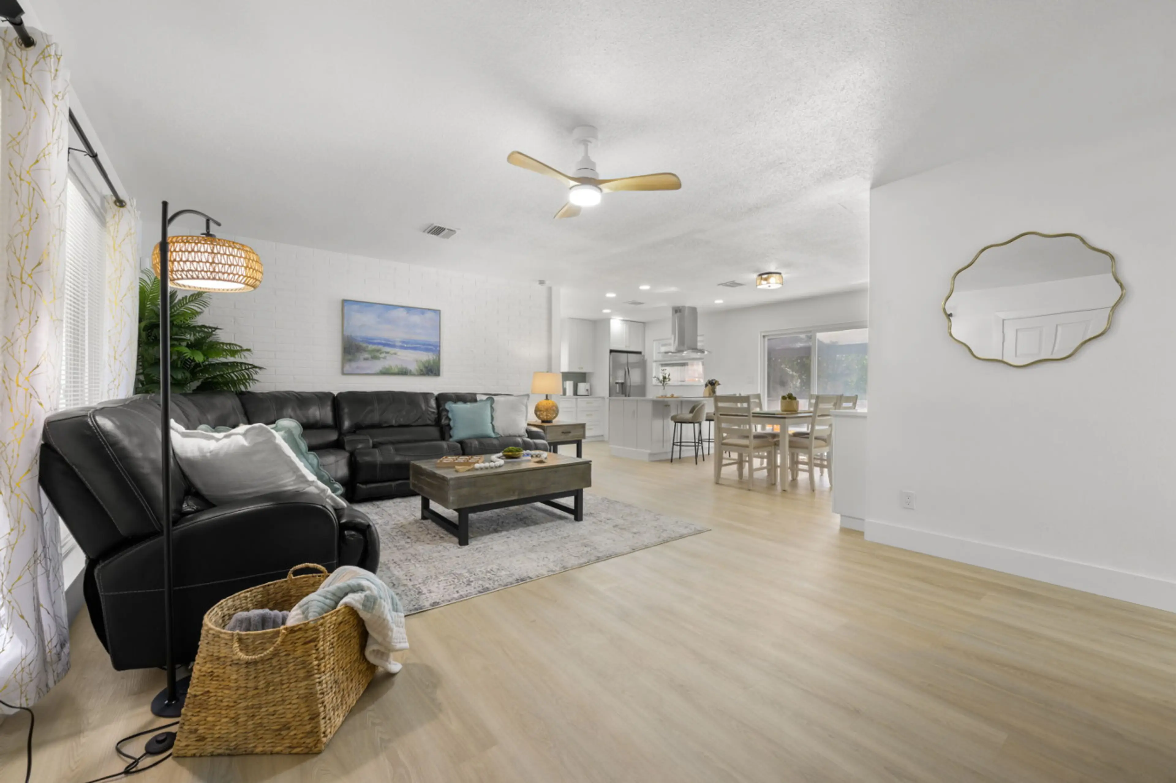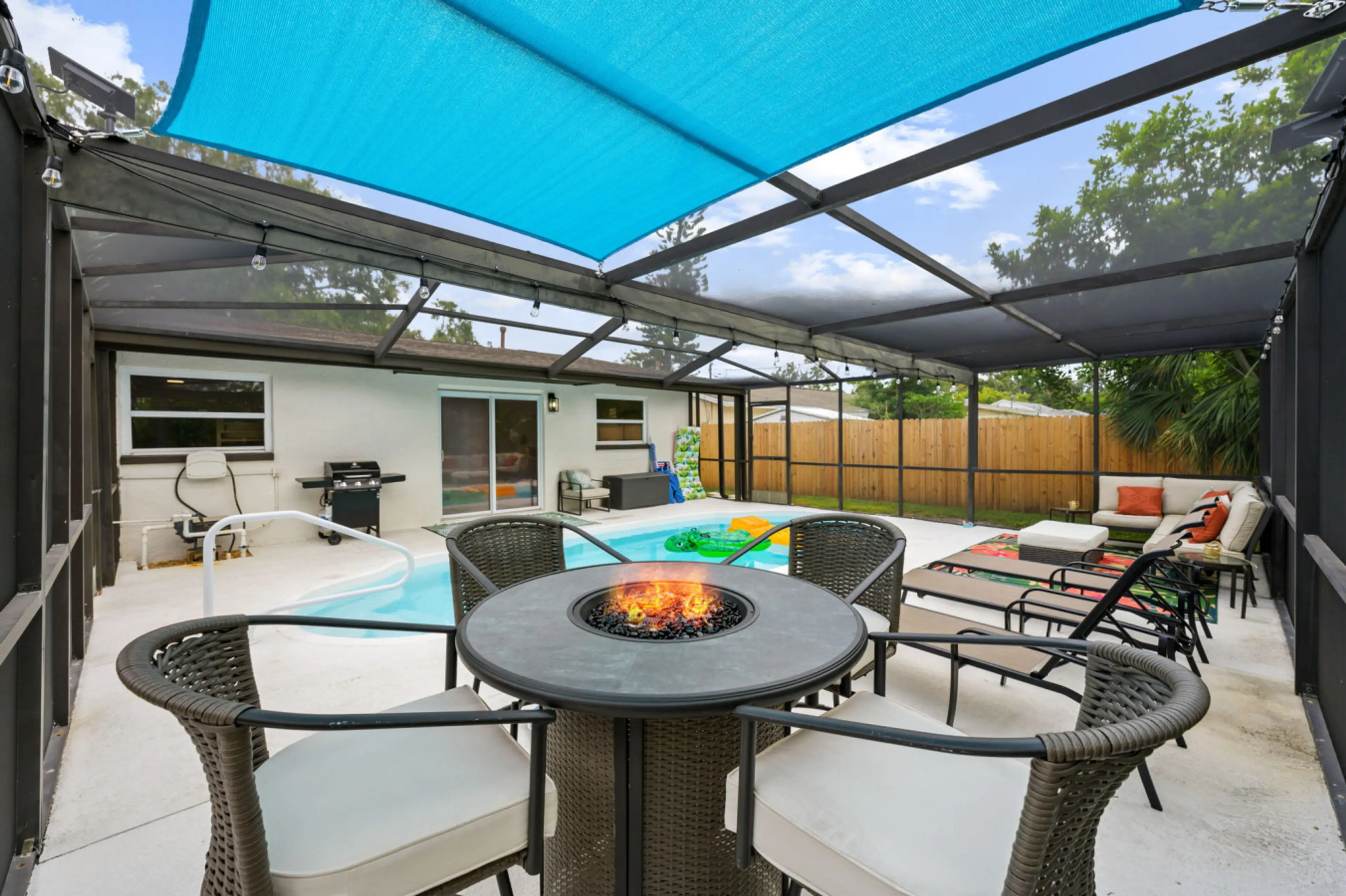 Welcome to your modern getaway! This 4-bedroom, 2-bath home is perfect for families and groups, featuring a spacious open layout, fully equipped kitchen, and cozy living area. Enjoy the private screened pool, outdoor firepit, BBQ grill, and backyard games. Bedrooms are styled for comfort with fresh ...